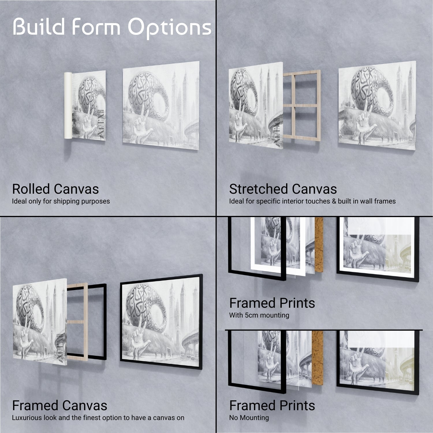 The ultimate luxury option. Your artwork is printed on 100% cotton matte canvas, hand-stretched on solid wood, and elegantly framed for a timeless finish.